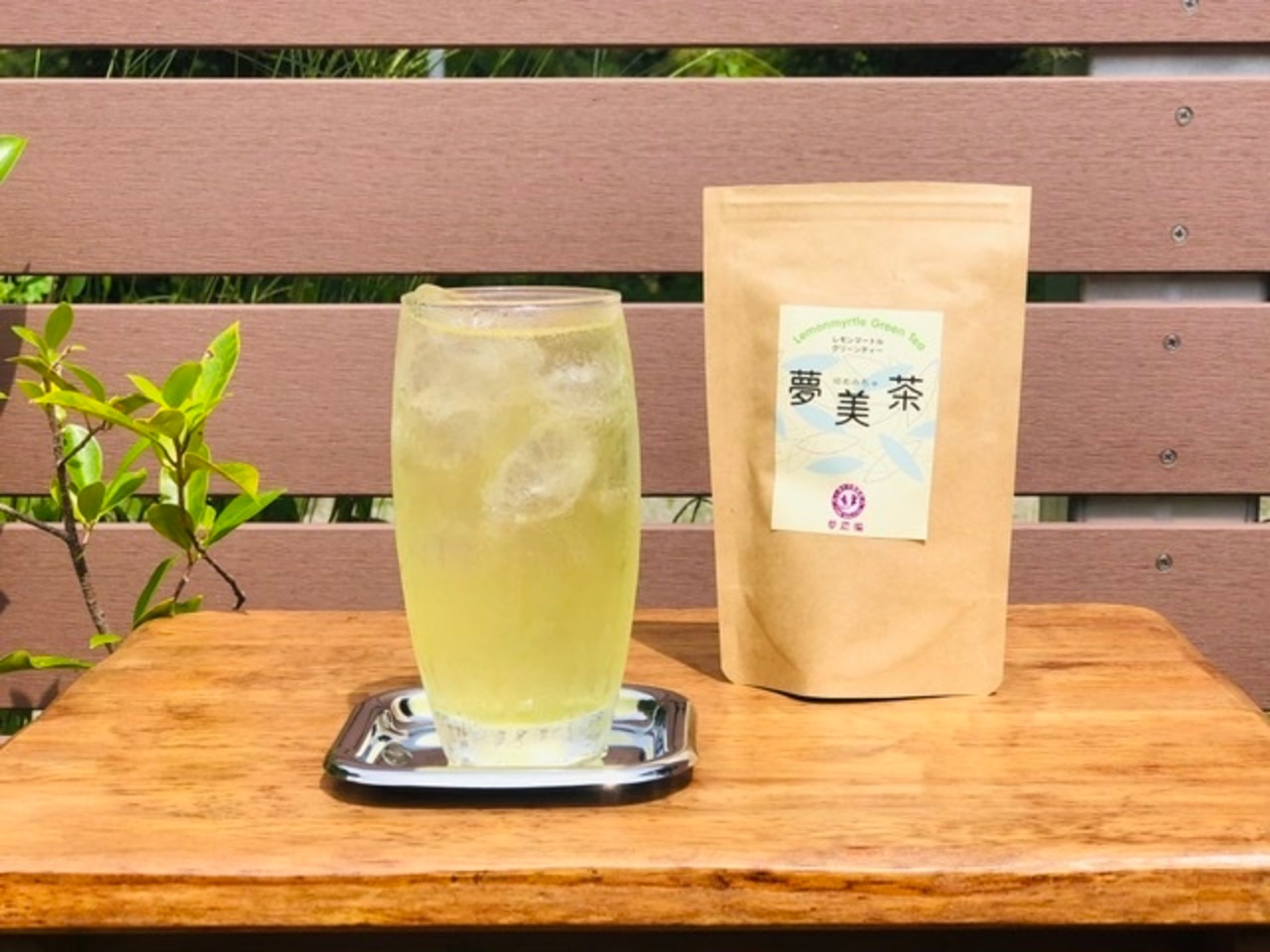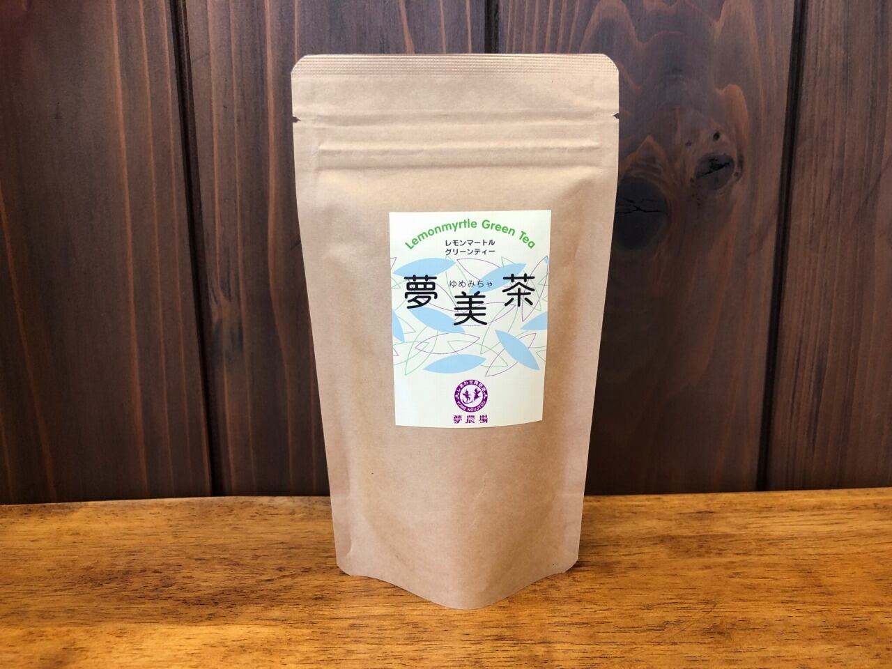 夢農場で一番人気のオリジナルハーブティー夢美茶(ゆめみちゃ)。レモンよりもレモンの香りがするハーブ『レモンマートル』と緑茶とをブレンドした後味スッキリの新感覚ハーブティー。