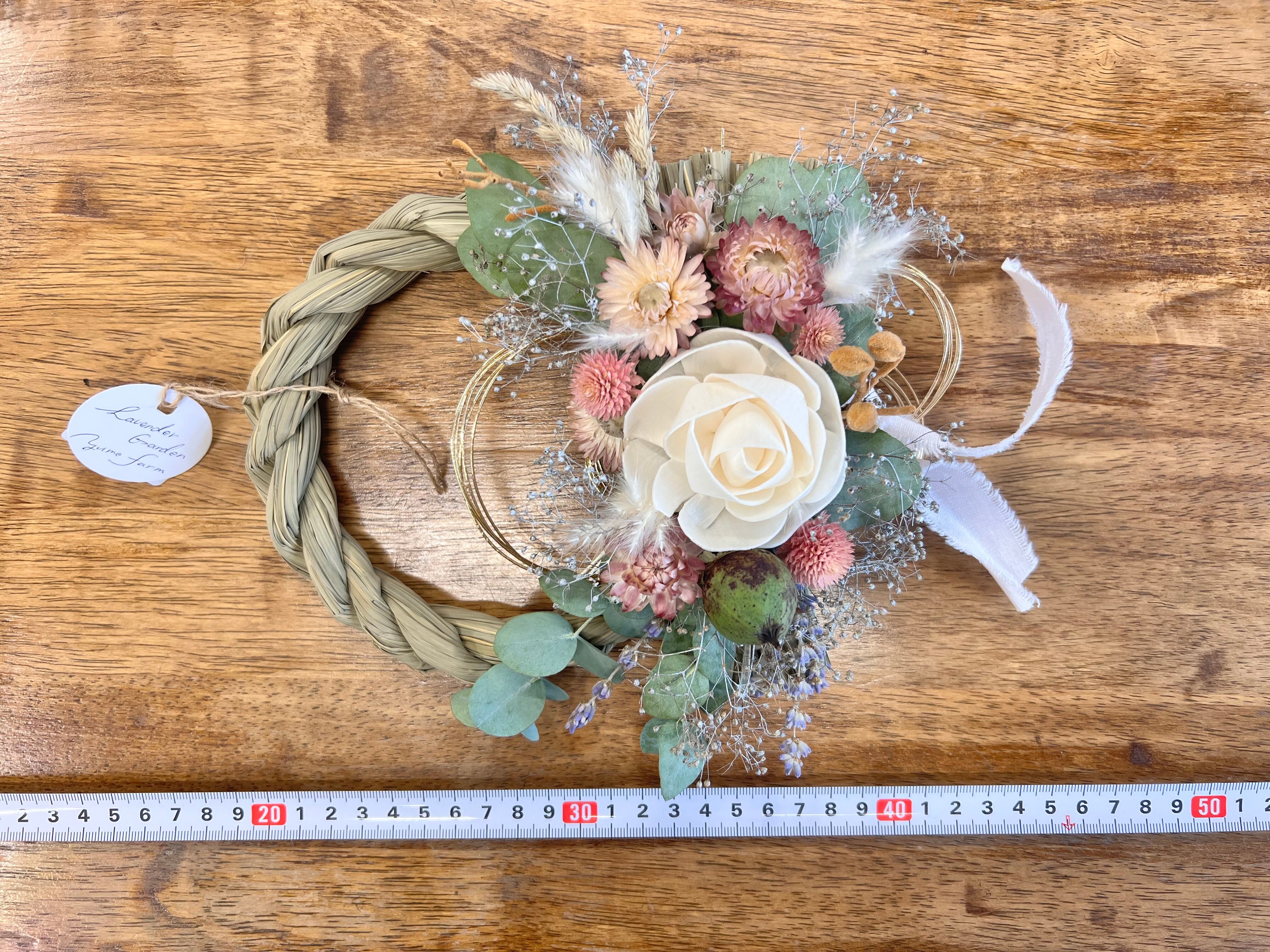 花とハーブの里『池田町』の自然素材を活かしたしめ縄飾りです。しめ縄に、夢農場で収穫したラベンダー、綿の実、ユーカリなどで飾り付けました。飾り中央の白いソラフラワーにお持ちのエッセンシャルオイルを垂らすと、香りも楽しめ心地よい新春を演出します。